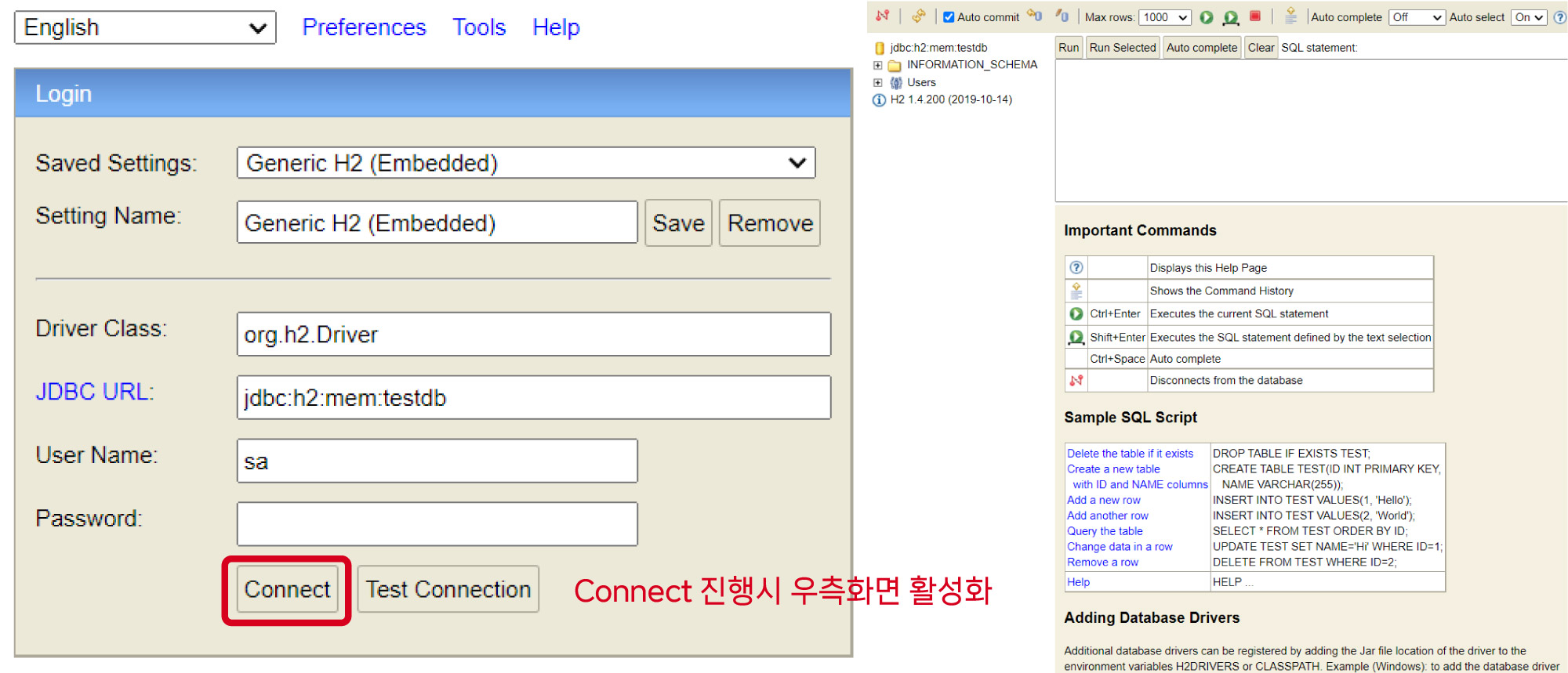 5. http://localhost:8080/h2-console 접속 ▶ Connect 클릭하여 접속하면 웹콘솔화면 활성화됨